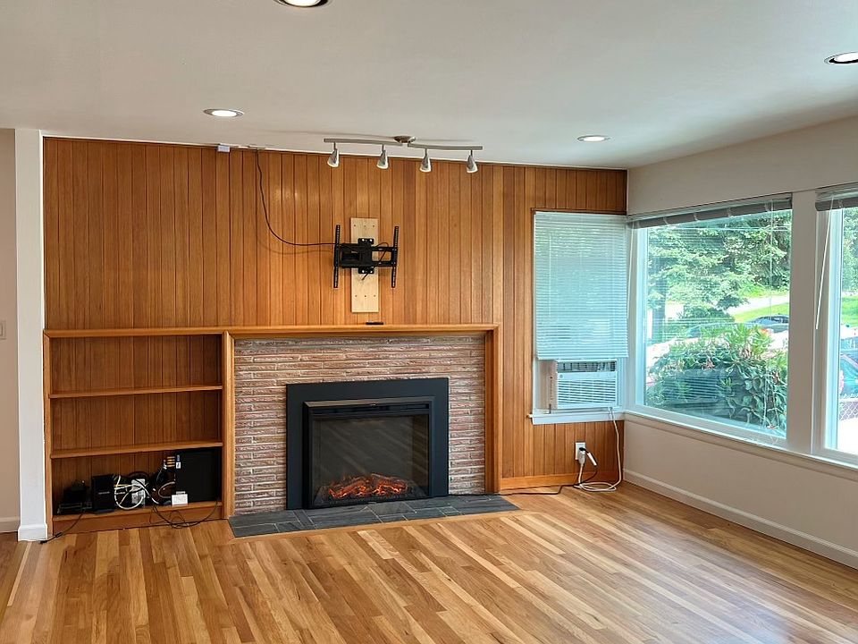 Spacious living room with real hardwood floors, warm wood accent wall, and a cozy electric fireplace