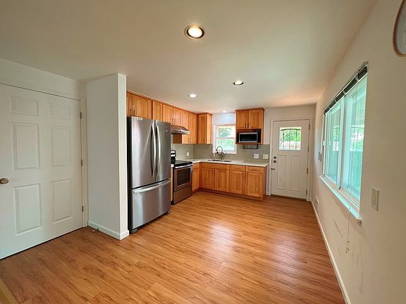 Updated kitchen with stainless steel appliances (refrigerator, oven, range hood, microwave) and solid wood cabinets