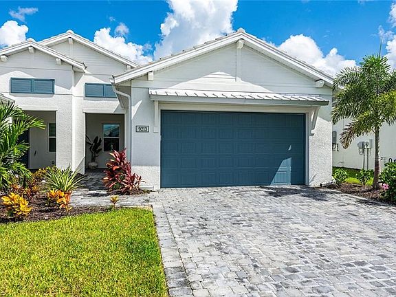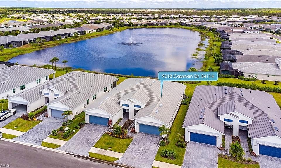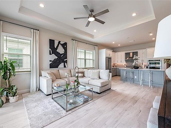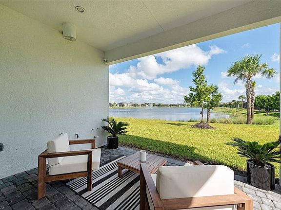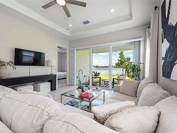 Step into contemporary elegance with this newly built Baypointe villa offering glimmering lake views and brimming with over $100,000 in luxurious upgrades inside and out, in the picturesque community of Azure at Hacienda Lakes by Toll Brothers. This turnkey furnished home is a true sanctuary of modern living, designed with an open-concept layout featuring 10’ to 10’6 ceilings and impact glass windows and doors. The gourmet kitchen features high-end appliances, an eye-catching glass tile backsplash, a natural gas cooktop, a large island, ample cabinetry, and a pantry. Features include upgraded tile flooring in the main living areas, tray ceilings with crown molding, 8’ tall solid doors, a tankless hot water heater and epoxy garage floors. This villa includes a versatile den that can easily be transformed into a 3rd bedroom. The primary suite boasts a large walk-in closet, a walk-in shower with frameless glass door entry, and dual sinks. The covered lanai prepped for an outdoor kitchen is the perfect spot to enjoy the tranquil lake views. The resort-style community amenities feature a catering kitchen, game room, and a cutting-edge fitness center within the stunning clubhouse. The expansive community pool, complete with a spa, invites you to unwind, whether lounging in the sun or relaxing under a covered area. Pickleball and tennis courts offer additional leisure options. Azure at Hacienda Lakes is a gated community in a prime location, close to shopping, dining, and entertainment, and minutes from downtown Olde Naples and powder-soft Gulf beaches, close to shopping, dining, and entertainment, offering the perfect blend of luxury and convenience.