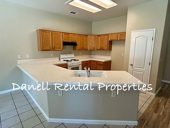 The large open kitchen includes tile countertops, pantry, kitchen nook overlooking the backyard, and tons of cabinet space with lots of natural light.