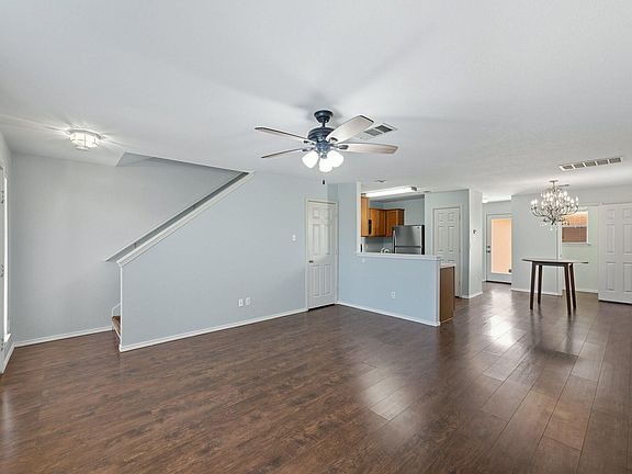This lovely 2-story home is located in the desirable 78744 area of Austin. As you approach the property, you'll notice a sizeable front yard with exterior steps that guide you to a cozy front porch, perfect for relaxing and taking in the surroundings. Upon entering, you'll appreciate the open and functional layout, which features high ceilings and abundant natural light throughout. The living room is equipped with a ceiling fan and offers serene street views, seamlessly integrating into the dining and kitchen areas. The dining space is conveniently open to the kitchen and is highlighted by a charming overhead light fixture that brightens the area. The kitchen is well-appointed with ample cabinet and countertop space, a convenient bar, and a pantry to help keep you organized. A half bathroom is also located on the main floor, adding to the convenience of the home's layout. The upstairs area features three bedrooms, including a primary bedroom with a ceiling fan, a walk-in closet, and an en-suite bathroom. The en-suite bathroom boasts a window, a bathtub/shower combo, and sleek tile flooring. The two secondary bedrooms also feature ceiling fans and walk-in closets, providing ample storage and comfort. The fully fenced backyard is great for outdoor entertaining, with patio space and a clean walkway that leads to a detached 2-car garage. This outdoor space offers a serene atmosphere, ideal for relaxation or spending time with family and friends. This home is conveniently located near shops, restaurants, and Highway 35, making it an excellent choice for those looking for a balance of tranquility and accessibility.