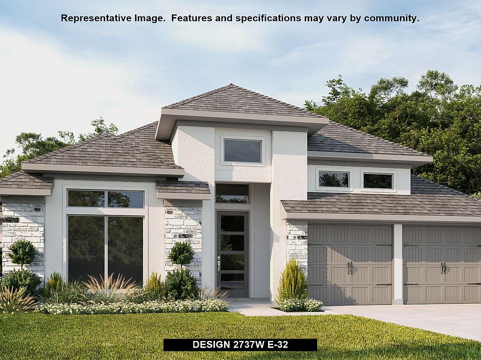 Home office with French doors set at entry with 12-foot ceiling. Game room with French doors off extended entry. Family room with a wood mantel fireplace and wall of windows opens to kitchen and dining area. Kitchen features walk-in pantry and generous island with built-in seating space. Primary suite includes bedroom with wall of windows. Double doors lead to primary bath with dual vanities, garden tub, separate glass-enclosed shower and oversized walk-in closet. A guest suite with private bath adds to this four-bedroom home. Extended covered backyard patio. Two-car garage.