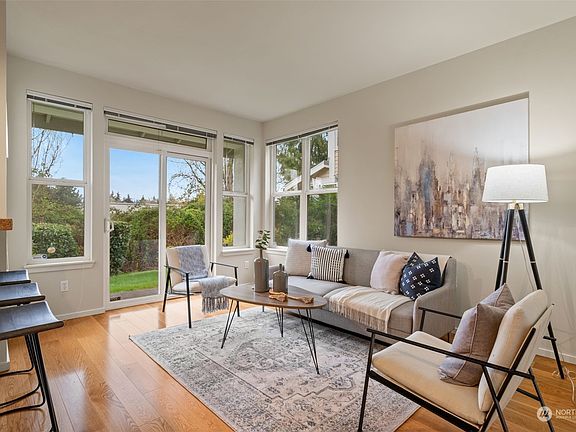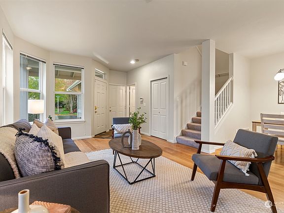 Welcome to Rivertrail! This meticulously maintained End Unit boasts 1,518 sq ft of delightful living space, and offers a perfect blend of comfort & convenience. Enter to gleaming hardwoods, spacious living & dining areas, cozy gas fireplace, peninsula kitchen, generous primary suite w/vaulted ceilings, walk-in closet & 5pc bath, and 2 additional bedrooms for office/gym/guests. Relax on the west-facing patio, great for bbq and al fresco dining. Attached 1-car garage plus 2 driveway spaces, ample guest parking, and well maintained HOA. Walking distance to amenities, short commute to Microsoft, Amazon, Meta, and convenient access to the Sammamish River Trail for biking/jogging/walking. Top Rated Lake Washington School District!