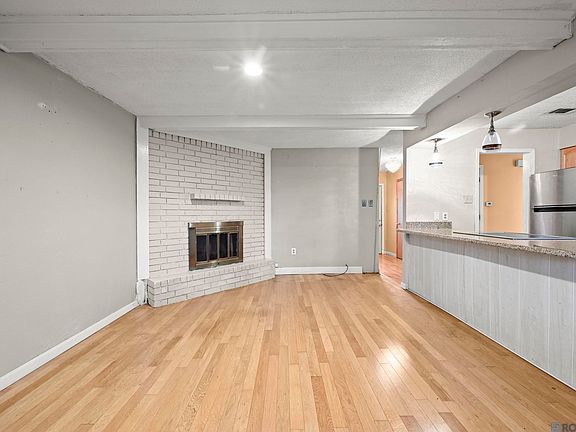 Fully fenced backyardStainless steel appliancesGranite countertopsUpdated pendant lightingKitchen islandSpacious kitchenPainted brick fireplace
