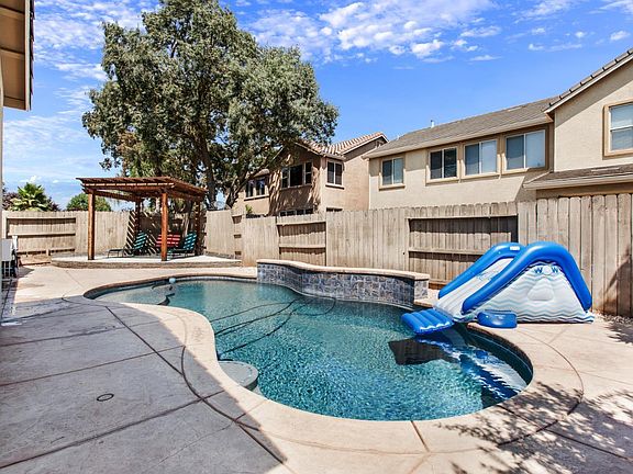 Price reduction! This amazing home just became an even greater value at $764,500! Don't miss this incredible opportunity to assume a loan of $410,000 at a low 2.25% interest rate, making ownership more affordable than ever. Buyer will need to bring cash or secure a second loan to cover the remaining balance. Loved by one family since it was built in 2008! This home is immaculate and you won't believe it's ever been lived in! Enjoy energy efficiency with solar panels on both the pool and home, LED lights throughout, turf in the front yard, and a beautiful stamped concrete back yard with a covered patio & pergola, designed for relaxation and entertaining. Inside, you'll find a stylish, modern interior with luxury vinyl flooring, newer carpet, and higher baseboards that add a fresh, elegant touch. The kitchen is a chef's dream w/double ovens, a new microwave, a large pantry, and plenty of space to gather in the family room combo! The bathrooms are updated with newer fixtures! Home also has a water softener! This home blends function, beauty, and efficiency - ready to move right in and enjoy the holidays in your new home!