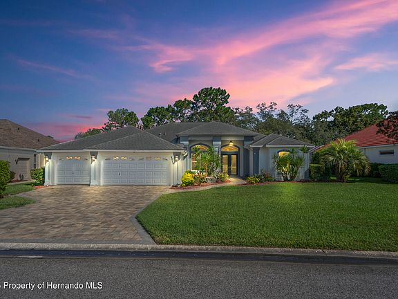 PRICE IMPROVEMENT 15,000 !!!Welcome to this exceptional custom home located directly on the 8th hole of Glen Lakes' championship golf course ranked among Florida's top 20! This spacious 3-bedroom, 3-bathroom residence with a 3-car garage offers breathtaking views, elegant upgrades, and an entertainer's dream layout. Step inside to soaring ceilings and an open-concept design featuring a formal living room, cozy family room, and a beautifully updated kitchen with a large island—perfect for hosting gatherings. The oversized screened lanai showcases a heated pool and spa, with new tile, resurfaced decking, and panoramic views of the fairway. This is a must see!! New A/C 2020, New pool heater 2020, 3 new ADA toilets, Paint exterior & interior 2021, Driveway pavers/sidewalk 2021, Pool was resurfaced 2021 including new lighting & Spa & tiles, New appliances 2023, Lanai resurfaced & paint 2023,New luxury plank flooring throughout & 5 inch baseboards 2025, New well pump filter, New stone work fireplace & floor 2025, New LED lighting in kitchen, family room, pool, cage, backyard landscaping 2025. This home has a salt water pool, & Pentair app to control the pool by smart phone. This home is located on the inside loop and dead-end street, This is a home ready to move in. Enjoy your extra space in the garage for your golf cart & drive to the shops outside the front gate. This Home is 45 minutes from Tampa, Minutes from Pine Island beach, under an hour to some of Florida's best Beaches. Join the social clubs, including Italian, Garden, Kayak, just to name a few. Veteran memorial & Park, Dog park, Pickleball courts, Tennis, Pool, Gym, Fine dining, and many more beautiful things to be a part of living here. See you at the best clubhouse & fun times here in Glen Lakes Estate. This home won't last long being located on the golf course. Plenty of activities for you and your guests