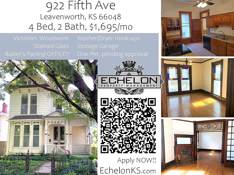 Move-In Ready!! 4 Bed, 2 Bath Home with garage. AMAZING Hardwood flooring with inlay designs, detailed wood molding, decorative fireplaces, and 10-foot tall doors. Primary Bedroom has an attached sitting room that could be used as a fourth bedroom!! Grand Living, Parlor and Dining rooms. Large butler's pantry right off the dining room for convenience and could be used as a HOME OFFICE!! Two full Bathrooms, one on each floor!! Washer and Dryer hook-ups. Garage storage. No Smoking. Minutes away from Downtown Leavenworth, Lansing, Fort Leavenworth, and the Greater Kansas City Area!!
