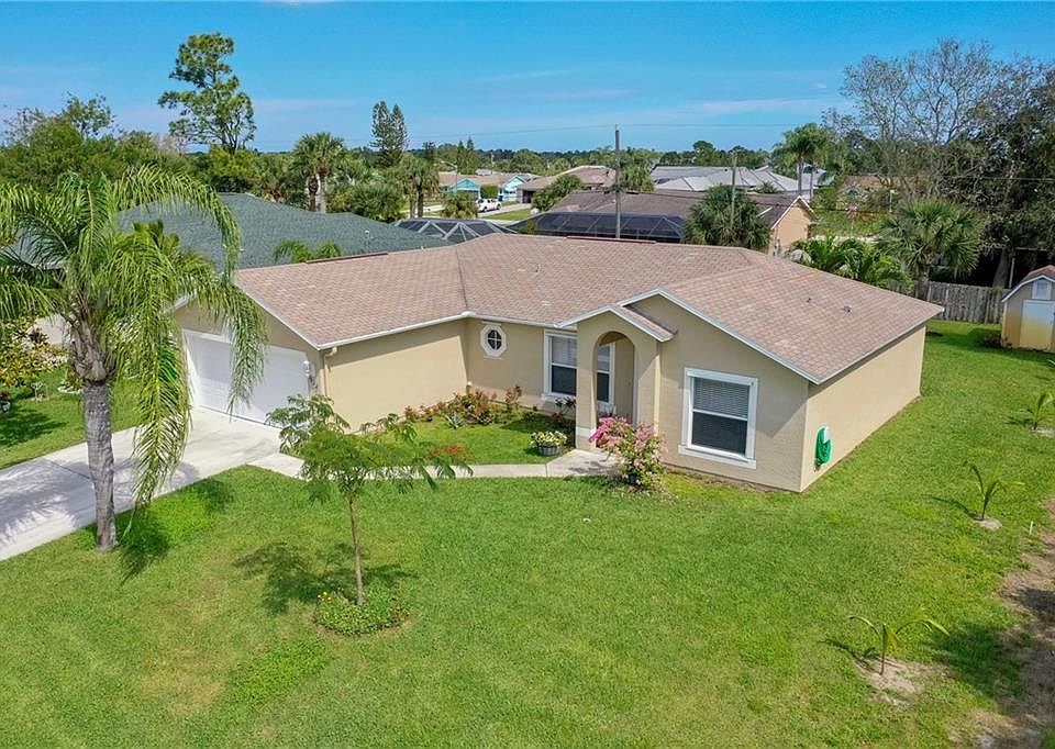 This concrete block home is a 3 bedroom split plan. Master bath has both a shower and soaking tub. Home boasts high ceilings, inside laundry and open concept! Lush landscape makes this home a beautiful Florida paradise to enjoy from the screened back porch! Great location on a very nice street with well kept and manicured homes surrounding it! Room for pool and toys!