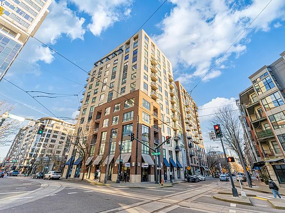 Perfect SW corner unit overlooking Jamison Square & the west hills. Lovely finishes t/o in this 1 bedroom + den. Island kitchen with gas range, lots of storage and easy space to entertain. Great room opens to two patios which offer lots of outdoor options. Wood flooring + tile in bathrooms. Walk-in closet in primary bedroom & large bathroom. Den is perfect guest space + work from home. Deeded parking & storage. Newer heat pump. Concierge building with solid HOA. Streetcar access out your door!