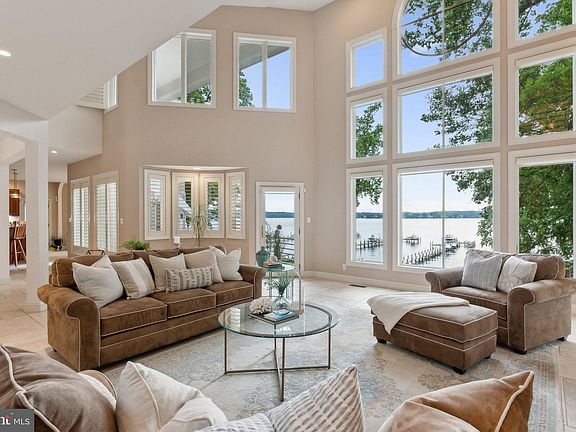 "Sunset on the Severn" — A gated, custom contemporary estate perched on 72 waterfront feet with a private pier, boat & jet ski lifts. A dramatic two-story great room with floating catwalk and wall of glass serves as the heart of this entertainer’s dream. Just 15 minutes from downtown Annapolis, this Severna Park residence offers refined seclusion with seamless access to the heart of the Chesapeake. Designed to open upward and outward—toward light, toward water—every inch of this home invites you to embrace the surrounding beauty and live in rhythm with it. The main level blends form and function, anchored by a spacious eat-in kitchen and breakfast bar that flow effortlessly into both formal and informal living areas. A tucked-away family room with custom built-ins creates a cozy retreat, while art niches and clean architectural lines lend a sense of curated calm. Upstairs, the expansive primary suite features a private balcony with tranquil views, a custom walk-in closet, and a spa-like bath with dual vanities, a jetted tub, and a walk-in shower. A rear staircase leads to two additional bedrooms, a full bathroom, and a dedicated upstairs laundry. The walkout lower level is built for entertaining, featuring a stunning antique Victorian bar and a generous recreation room with an additional bedroom and a full bath. Just outside, a stone patio and manicured gardens offer a peaceful escape where birdsong and river breezes create a sense of timeless calm. Additional highlights include an oversized three-car garage with extensive storage, solar panels for year-round efficiency, a stone-paver motor court, a lily pad pond, and a garden path that gently winds to the private waterfront. Here, you don’t just live by the water—you live in rhythm with it. Affectionately named Sunset on the Severn for its breathtaking evening views, you will absolutely love being home.