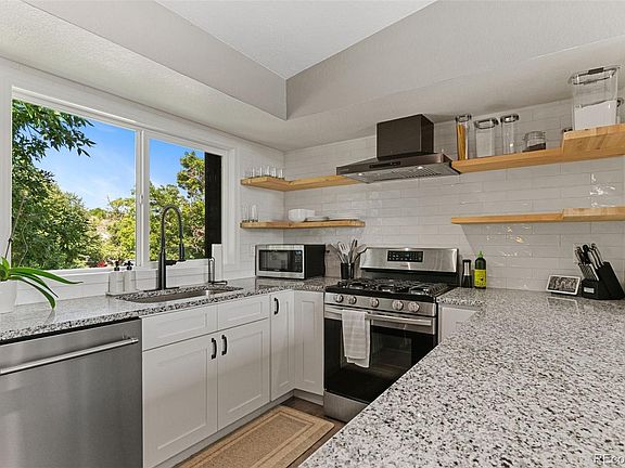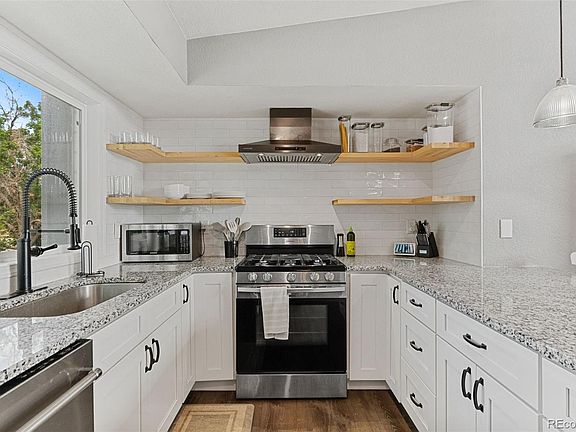 Step into a modern kitchen that’s been fully renovated with granite countertops, stainless steel appliances, designer lighting, and elegant floating shelves—perfect for cooking and entertaining.