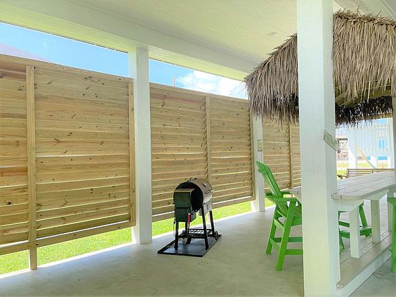 Beautiful Custom-Built Beauty in the Tidelands Subdivision, a short walk or golf cart ride to/from the beach. When entering the front door, you'll find an Open Concept w/ Living Area w/ Tall Ceilings, Wood Planked Ceilings, Large Windows, Coastal Furniture, an Electric fireplace for those chilly winter nights, Shiny Modern Kitchen w/Quartz Counters, Stainless Appliances, Charming Wooden Island (PLENTY OF STORAGE)/Breakfast Bar, Ice maker, Wine Cooler. Primary Bed/Bath tucked away in the back, having it's own special Charm w/White Shiplap Walls, Beautiful Tiled and Glass Shower, Double Built in Bunks, Two beds in 1st bedroom. Other features include Wrap Around deck for easy Maintenance, downstairs sand shower, Tiki Bar, Privacy Walls, Garage. Includes EXTRA 5000 sq 'Lot behind the home for more privacy and elbow room. A Zone Insurance ( Bargain!). All Deck and downstairs Furniture remains with the house. Never a Rental. Make it your own little place to Escape. View of the Ocean