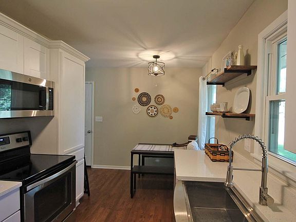 The kitchen features new cabinets with crown molding, quartz countertops, and farmhouse sink.