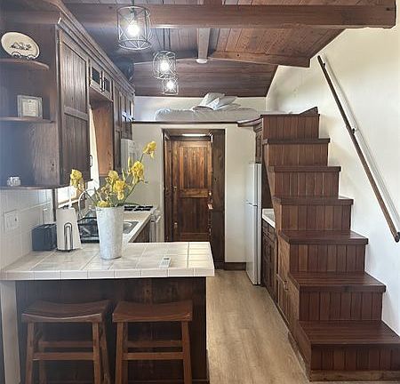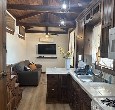 Step inside this rustic custom-built tiny house with vaulted wood beam ceilings, a well-appointed kitchen with tile counter tops, gas range, dining bar, coffee bar and refrigerator. Bathroom with a shower. The living space comes furnished with a sofa, queen size bed, ceiling fan and TV. Laundry hookups with washer and dryer included. Gas, electricity, garbage, and WIFI are all included in your monthly rental amount!! Mini split heat and air unit. Renters insurance required.