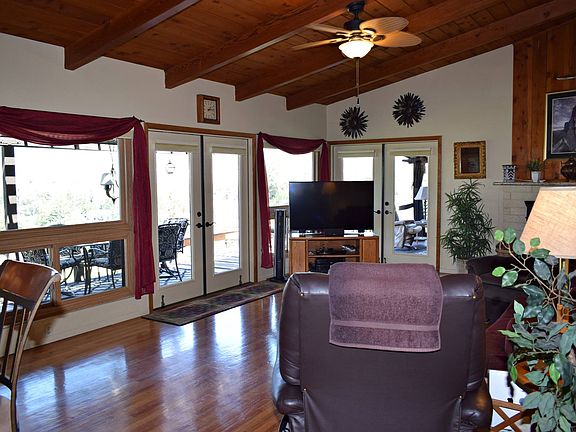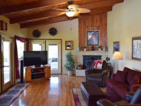 Entertainer’s Dream & Spectacular Mountain & Valley Views. Peaceful Location on Dead End Street. Open Floor Plan of Living Rm, Dining Rm, & Kitchen have Beautiful Open Beam Ceiling With Views of Mountains. Built-In Bar. New Samsung Kitchen Appliances. New Flooring Kitchen & Dining Room. Refurbished Kitchen Cabinets with Roll Out Shelves. Custom Wood Doors. Hardwood Floors in Bdrms & Baths. Wood Burning Fireplace. Lovely French Doors from Master Bedroom to Pool & Patio. New Drought Resistant Landscaping, Artificial Turf & Sprinkler System, Fruit Trees, Pond & Fountain, Custom Outdoor Lighting. Patio with Hardwired Chandelier. New Roof, New Paint Interior & Exterior, New Triple Pane Windows, New Custom Double Cell Graber Blinds, Central Vacuum. Small In-Ground Pool with Energy Saving/Water Saving Custom Cover. Extra Large Garage 2 ½, Built In Storage, New Garage Door. RV Parking with 50 Amp Hookup. Backyard Pagoda, Spa, 4 Storage Sheds, Custom Copper Wind Sculptures, Telescoping Flag Pole: all Convey. Zoned for horses, chickens, goats, etc.