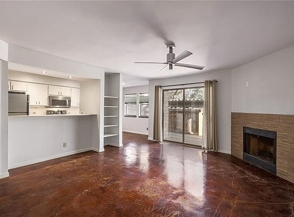 First-floor, Upgraded one-level/end unit condo w direct-access parking has 2 bedrooms, 2 full baths. Kitchen has quartz counters, under-mount sink, under-cabinet lighting and stainless appliances. Updated baths include quartz counters plus modern sinks, faucets and lighting. Upscale window treatments in bedrooms and dining area. Stained concrete floors and designer lighting give modern vibe. Stackable W/D & fridge come w lease. Well-managed complex. Close to Whole Foods, Domain, Arboretum & top employers.