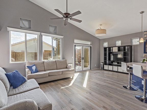 Great energy-efficient home in gated part of Augusta Ranch! You will love the newer a/c, replaced roof, newer water heater, some newer windows, owned solar and other modern updates. Features: newer wood tiled flooring, vaulted ceilings, and a modern great room with bountiful natural light and backyard access. Delightful kitchen exhibits plenty of cabinets with crown molding, newer appliances, newer quartz counters, stone backsplash, & a center island w/ breakfast bar. French doors open to a den that can be used as an extra bedroom/office. Main suite includes an updated bathroom w/tiled shower, new vanity/plumbing/light fixture. Enjoy the beauty of the sunrise in the backyard, providing a covered patio, artificial grass, pavers, and storage shed. A must see!