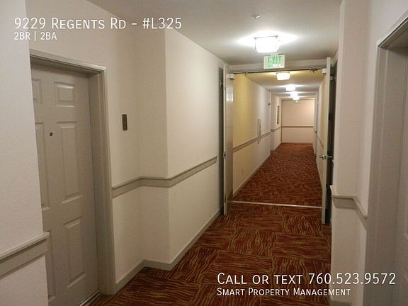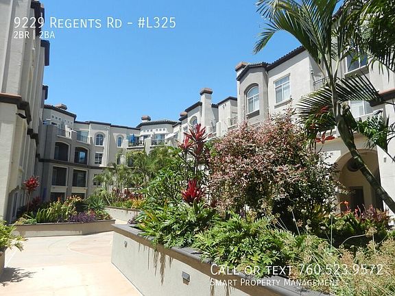 9229 Regents Road #L325, San Diego, CA 92037 UTC Condo single level 2 bedroom/ 2 bathroom/ Air Conditioning/ 1063 SF. PRIVATE GORGEOUS 3RD FLOOR UNIT WITH 2 ASSIGNED UNDERGROUND GATED PARKING SPACES. ENJOY THE COMFORT OF BRAND-NEW CARPET THROUGHOUT AND UPDATED FLOORING IN THE KITCHEN AND BTAHROOMS, GIVING THE HOME A FRESH, MODERN FEEL. LARGE UNIT WITH OPEN FLOOR PLAN. CENTRAL AIR CONDITIONING! FLOOR PLAN HAS DUAL MASTER SUITES IDEAL FOR ROOMMATES. PRIVATE BALCONY. FULL SIZE LAUNDRY IN UNIT! COMPLEX HAS AMENITIES LIKE A RESORT W/EXERCISE ROOM, POOL AND SPA! BBQ, CLUBHOUSE, SPORTS BAR AND KITCHEN AREA WHICH CAN BE RESERVED FOR EVENTS. CLOSE TO UCSD AND UTC MALL. WALKING DISTANCE TO STORES AND COFFEE. com. Thanks so much for your interest! This Property Professionally Managed by Smart Property Management