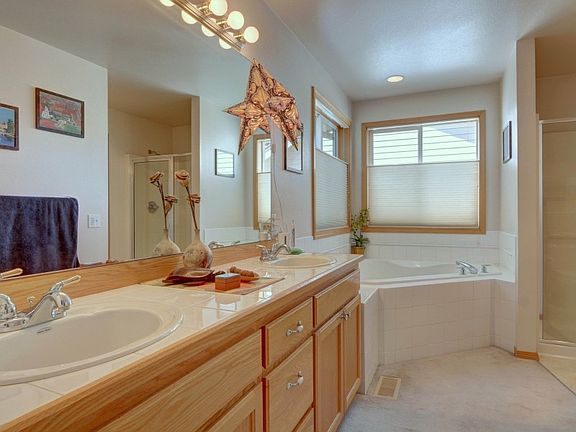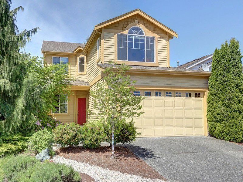 Great room style 3 bedroom plus den! Tiled island kitchen features gas cooktop, microwave, hardwood floors and pantry. Large master bedroom with vaulted ceilings and sconces. Full Master bathroom includes dual sinks, soaking tub, separate shower and oversize walk in closet. Main floor laundry room. 2 car garage. Private backyard is fully fenced and features a very large patio. Cedar siding. Across the street from North Creek Park!