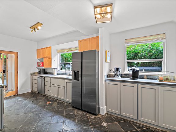Cozy tile fireplaceFully stocked kitchenRich architectural detailsElegant millworkLeaded stained-glass windows