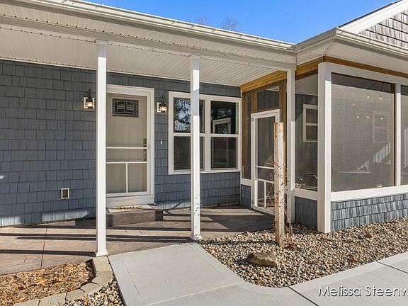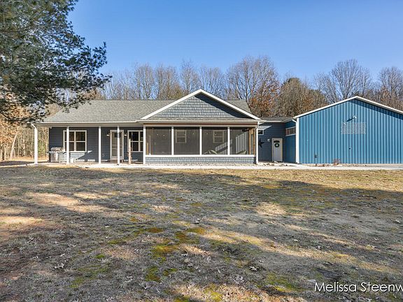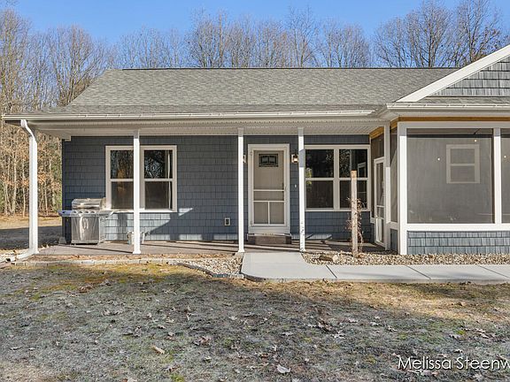 Built 2017. 3 bed, 2.5 bath home w/ attached 1500 square foot garage located on 2.64 acres . Garage has 3 extra tall overhead doors, 2 - 240v outlets and one 220v outlet, plumbed for air compressor. One-level living, large door openings, low threshold showers, main floor primary bedroom, main floor bathroom. Electrical is set up to connect to a generator when needed. The kitchen has quartz counters, soft close doors/drawers, farmhouse sink, stainless appliances, and seeded glass display cabinets. Kitchen flows into a large dining area & living room w/ soaring ceilings. Basement includes egress window and 9' ceilings. Stained-stamped concrete front porch. Beautiful screened in porch. Close to Lake Michigan, Hutchins Lake, South Haven, Saugatuck, Vineyards. 1 bedroom doesn't have a closet.