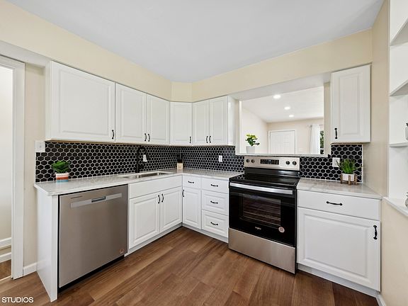 A Charming Ranch style home located walking distance to downtown, Lockport. This tastefully remodeled home features Four bedrooms and Two full bathrooms with full finished basement and garage. Kitchen offers: New Cabinets, Stainless Steel appliances 2024, quartz countertops, backsplash, sink, laminate/vinyl floors, modern light fixture. When you enter living room it greets you with new refreshed hardwood floors, recessed lighting and opens to dining room, kitchen and the hall leads to the bedrooms. Separate Great Room is perfect for office or playroom room, etc. This house is like new: doors, drywall, lighting, professional paint, flooring all through out the house is new. All windows have been replaced in 2024. AC and Furnace is 2024. Electric panel and wiring in the basement is 2024. Generous backyard with mature trees and shed for extra storage space to keep gardening equipment. New drainage system 2024! Basement is finished to perfection and offers enormous size family room. The Fireplace adds an extra touch of coziness to the room. Downtown Lockport offers so much such as entertainment, dining, train station, local museum, library, I&M Canal State Trail along by the Historic canal, and more. Conveniently located near by I-355, grocery stores, restaurants, schools.