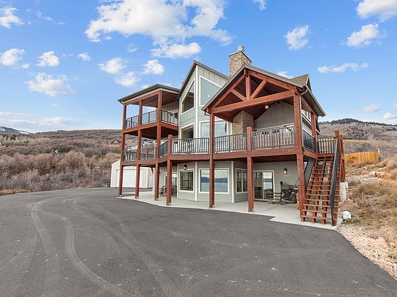 Enjoy incredible views of Bear Lake, the surrounding mountains and valley from this stunning triple-level custom home in upper Bear Lake West. The home features four extra-large bedrooms and four bathrooms, with a dramatic two-story great room on the main level showcasing expansive view windows and a beautiful rock fireplace. The great room opens onto a covered deck complete with an outdoor fireplace, while the upper level offers a covered balcony and the lower level includes a covered patio for year-round enjoyment of the scenery. The lower level also includes a spacious game room and a separate TV room, providing plenty of space for gathering and entertaining. Outside, a huge parking area and large detached garage offer ample room for vehicles, toys, and storage. As part of Bear Lake West, owners enjoy access to excellent amenities including discounted golf at the Bear Lake West Golf Course, Cooper's Restaurant and Sports Bar, an outdoor heated seasonal pool, an indoor hot tub, and private beach access to Bear Lake. Recreation surrounds you with Fish Haven Canyon just minutes away, offering miles of ATV/UTV and snowmobile trails, along with opportunities for snowshoeing, hiking, and mountain biking. Bear Lake State Park Marina is only ten minutes away, and Beaver Mountain Ski Resort is a short twenty-minute drive. Short-term rentals are not allowed by the HOA, ensuring a peaceful residential setting.