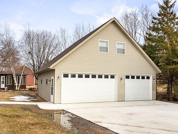 The attached insulated and heated garage is complemented by an incredible 34x36 two-story heated garage, complete with cabinetry and air conditioning—ideal for a workshop, hobby space, or tons of extra storage. The exterior shines with newer siding, newer roof and gutters, plus newly poured concrete driveways and sidewalk in 2024.