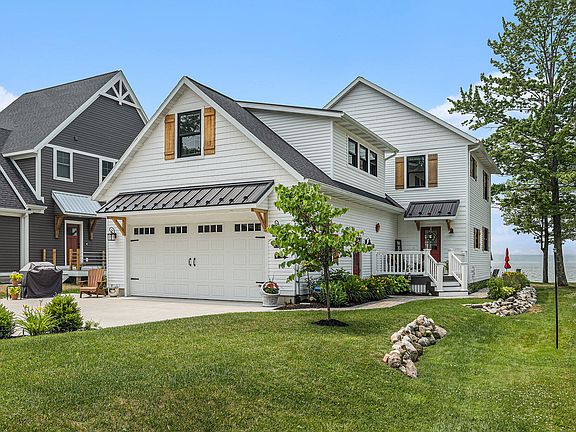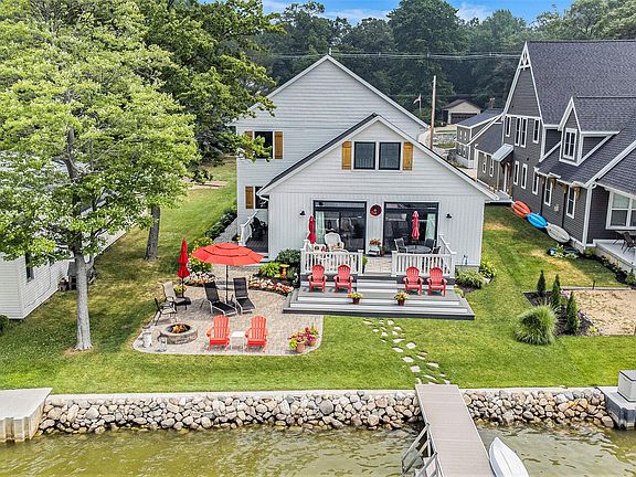 Welcome to your dream lakefront home! This stunning property offers everything you desire, from breathtaking SUNSETS to SANDY BOTTOM of 51 ft of lake frontage. With 5 bedrooms and 3 1/2 baths, this spacious home provides ample room for your guests.As you enter, you'll immediately notice the attention to detail and quality craftsmanship. The large closets throughout the house ensure that storage will never be an issue. The well-appointed kitchen features a pantry and cabinets made of full wood with dovetail construction, offering both durability and elegance. The under cabinet lighting adds a touch of sophistication, while the convenient touch-it kitchen faucet and farmhouse sink make your daily tasks a breeze.The living room boasts a cozy gas fireplace, perfect for chilly evenings and creating a warm ambiance. If you need additional storage space, a storage shed with electric is included, providing ample room for all your outdoor essentials.