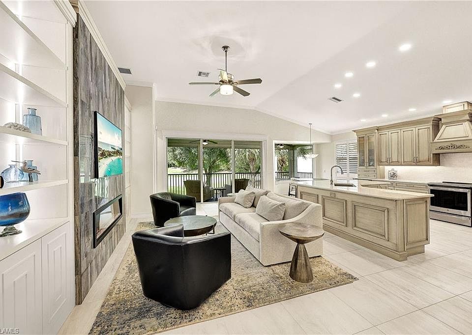 Welcome home to this stunning, completely redesigned carriage home in the Triana neighborhood of Renaissance! Bright, welcoming and thoughtfully remodeled with gorgeous details. Upon entering the main living area via the staircase or private elevator, you are greeted by a wonderful, airy space that feels even more expansive as it leads out to the gorgeous golf course view. Enjoy sunsets and sunrises with the south-facing long lake views of hole #2. The living room boasts a striking stone accent wall and a contemporary fireplace, creating a cozy and elegant focal point. Custom built-in shelving, complete with accent lighting, adds even more functionality and aesthetic appeal to an already beautiful living space. The chef's kitchen is a culinary dream, featuring luxury appliances, exquisite Cambria quartz countertops, a custom island that provides ample counter space for meal preparation and casual dining, and an abundance of storage. The expansive primary suite offers a private sanctuary with picturesque views, abundant natural light and a beautifully appointed en-suite bath. The bath features dual vanities, a walk-in glass shower and opulent finishes providing a spa-like retreat in your home. Each guest bedroom is designed with comfort and elegance in mind, offering generous closet space and easy access to the home's additional modern baths, which are outfitted with contemporary fixtures and luxurious finishes. Additional notable features of this remarkable home include custom built-in closets and designer lighting fixtures throughout, pristine matte tile and wood flooring, and ample storage space. The Renaissance lifestyle offers an Arthur Hills championship golf course with golf memberships available immediately, a lavish resort-style pool and pavilion, a children's play area, a full-service spa and fitness center, six red clay tennis courts, two pickleball courts and two bocce courts.