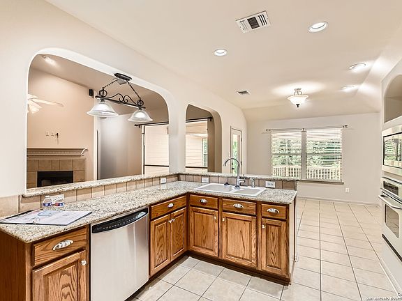 Located in Fossil Springs off of Loop 1604 and Hausman Road. This well-maintained single-story home offers 4 bedrooms or 3 bedrooms plus study - you choose!, 2 full baths, and open living space on a beautifully custom landscaped lot. Inside, you'll find an open layout with high ceilings, abundant natural light, and a cozy living room with a gas fireplace. The kitchen features upgraded granite countertops, a gas cooktop, built-in oven, ample cabinetry, and a large breakfast area. Sellers added additional recssed lighting thru out home. There's a dedicated office with French doors provides privacy for remote work, while a formal dining room offers flexibility as a second office or flex space. The spacious primary suite includes a walk-in shower, soaking tub, double vanities, and walk-in closet. Two additional bedrooms are well-sized and share a full bath. Outside, enjoy a wood deck with a custom awning, ideal for relaxing or entertaining. The backyard is fully fenced and features mature trees, manicured landscaping, and a storage shed for added convenience. Additional highlights include a two-car garage, laundry room with built-in storage, and close proximity to Loop 1604, I-10, and top-rated NISD schools. Move-in ready and located in a quiet, established neighborhood-schedule your showing today.