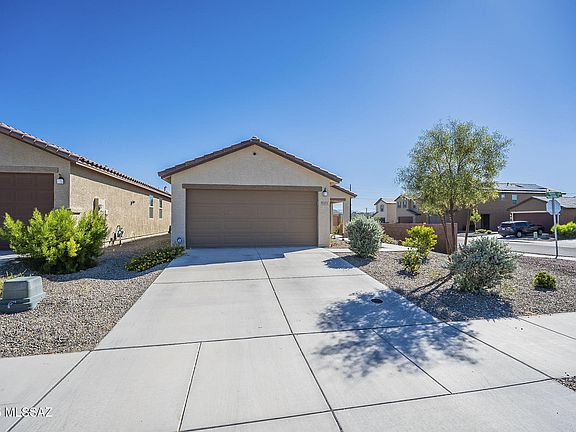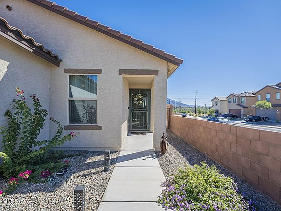 Location, location, location! Next to the Oro Valley Bike Path, close to the Foothills Mall, Store, Restaurants. This 2022 corner lot home has mountain and sunset views, three bedrooms, two bathrooms, a custom coffee bar with seating, a kitchen with a walk-in pantry with an outlet for appliances, and an island with extra cabinets. All rooms have upgraded ceiling fans, lighting, tile & carpet flooring, and custom window treatments. The primary bedroom has a garden tub, shower, and a walk-in closet with custom built-ins. The backyard features a screened-in patio, a TV mounted with power, a pergola swing, a gas outlet for the grill, and a beautiful landscape for entertaining. This home is in a great school district with many options. Price range $405K-$415k, it's a must-see!