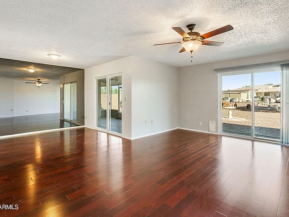 Welcome Home to Effortless Living! This immaculate 3-bedroom, 2-bath home radiates comfort, care, and charm. Step inside to a spacious, light-filled living area that flows into an inviting dining space — perfect for hosting. The updated kitchen and bathrooms, along with wood and tile flooring throughout, blend modern convenience with classic style. Unwind in the enclosed patio or step out to the fenced backyard, offering privacy and the perfect spot for gardening, relaxing, or letting your pets play. The oversized, 263 sqft, utility room with golf cart parking and generous storage, plus a two-car garage, add ease and functionality to everyday living. Ideally located just off Thunderbird near the Loop 101, you'll love being minutes from wonderful shopping and eateries, medical plazas, the vibrant Westgate Entertainment District, and multiple Sun City Recreation Centers offering pools, golf, fitness, and endless social activities. Move-in ready and easy to show, this home captures the best of the Sun City lifestyle: warm, welcoming, and ready for you to enjoy.
