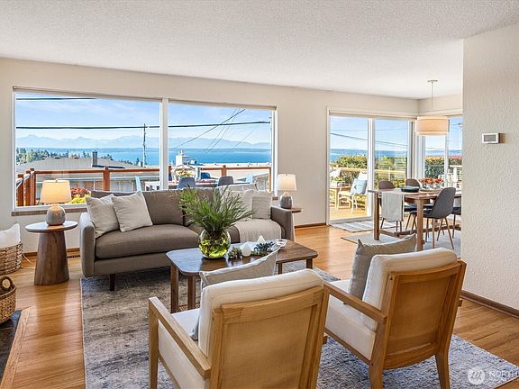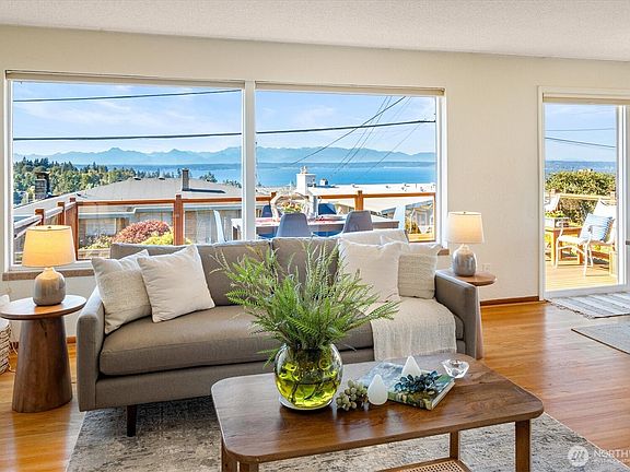 Built in 1955 and beautifully updated, this mid-century modern home has banks of picture windows capturing Sound & Mountain views. On the ridge near the Playfield, you will adore the abundant natural light inside. The Living & Dining rooms open to a big view deck- ideal for entertaining - w/steps down to the fully fenced west-facing, level garden. The interiors boast gorgeous hardwood floors, and a smart layout w/three bedrooms nestled together on the main floor. The remodeled kitchen features SS appliances, slab counters & new cabinetry plus a charming dine-in nook. The lower level has a spacious Family room, bedroom suite, utility area and a big two-car garage. In one of Seattle’s hidden gems, Olympic Manor, you are near everything!