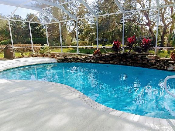 Spacious Addison built home in upscale Glen Lakes golfing community has 3 bedroom split plan Plus study/home office & 3 full baths! Entering through the leaded glass double entry you notice the architectural details such as columns, high tray ceilings, recesses and crown molding. Wood flooring in living and dining rooms and study/den, large tile in kitchen and all wet areas, bedrooms carpeted. Triple pocket sliding doors open up to the covered lanai and large screened area with a sparkling free form pool with stacked stone waterfall - great space for outdoor living, relaxing and entertaining. The spacious kitchen has lots of cabinets, pantry, breakfast bar and breakfast area overlooking pool area. Throughout the home, you will find lots of storage options including closets, pantry, built-in shelves and cabinets, and more. Master suite has sitting area, two walk in closets, private pool access and large master bath with glass block shower and garden tub. Built in Murphy bed and cabinets in third bedroom convey. Third bath is accessible from pool area. New roof installed October 2020, solar heated pool with new diamond brite finish in 2018. Pavered drive, oversized 24x25 garage that is climate controlled on separate A/C plus air filtration system. Enjoy the many amenities and activities available in the Glen Lakes gated community with 24-hour security. Conveniently located and close to shopping, dining, medical facilities and area recreational amenities including Pine Island Beach, boat ramps, library, bike trail and more. Easy commute to Tampa and international airport via Suncoast Parkway.