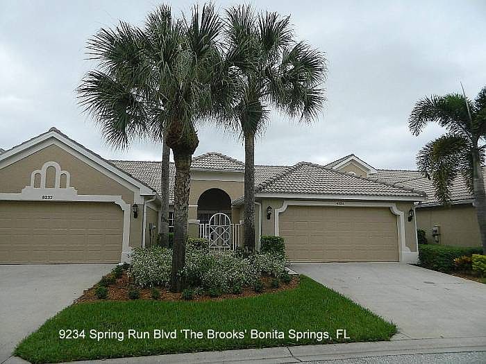 This may just be the nicest home in Spring Run. Meticulously maintained and upgraded by the original owners this villa pool home is an absolute must see. With 2 bedrooms plus a den (Sabal floor plan), a heated pool and spa, lake and golf views and extensive upgrades including stainless steel appliances, custom kitchen cabinets, 18" tile on diagonal, new carpet in bedrooms, crown molding, fresh paint, new ceiling fans, all new bathrooms (glass showers, tile work, sinks, toilets, flooring), pool and lanai refaced and retiled, automatic hurricane shutters on lanai, and new A/C and water heater in 2010 this home is like new and ready for a new owner. Spring Run is a bundled golf community located within The Brooks in Bonita Springs. The location cannot be beat - close to everything Southwest Florida has to offer: Coconut Point Mall, Gulf Beaches, restaurants, the airport, parks and recreation, and Naples. If you are ready to live the Southwest Florida lifestyle, call us for your private tour of this stunning home and golf community today. A complete list of upgrades and floor plan is available.