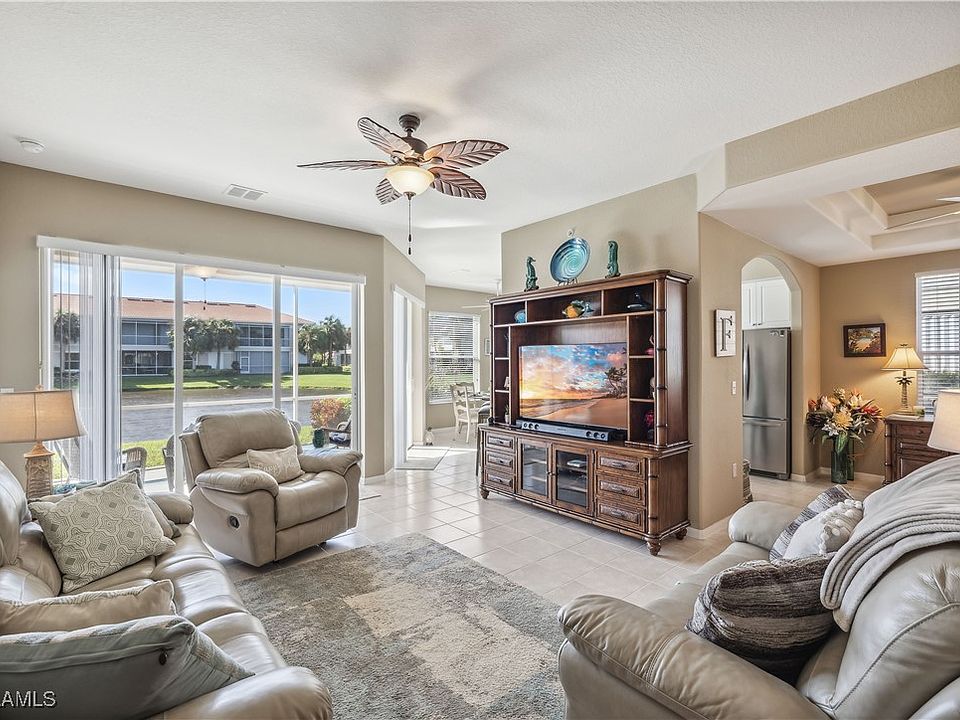 SOUTH-FACING PEACEFUL WATER VIEWS! Rarely available first floor condo in this amenity-rich gated community of Laguna Lakes in South Fort Myers. This condo is immaculately maintained and conveniently located close to popular beach areas. This spacious first floor condo is an end unit and offers abundant natural light and a gorgeous lake view as you walk through the door. There are three bedrooms with high-end carpet in the bedrooms and tile throughout the main areas. You will have your private garage for a car and bikes and also plenty of storage inside with large closets; and, yes, plenty of space for a home office. Enjoy your gorgeous view from your lanai at all times of the day and evening, and this sought-after calming backdrop is visible from the kitchen, living room and main bedroom. Kitchen appliances were replaced in 2019 and were only used seasonally. The buildings all have new tile roofs and have been freshly painted. This is Florida condo living at its very finest, a perfect area for walking, jogging and bike-riding safely, and look what amenities are available for residents for indoor or outdoor enjoyment - pickleball/tennis, community pool/spa, a kiddie pool, beach volleyball, a billiards room and a gym. There is even a fishing pier. Lawn maintenance, fiberoptic cable and Internet included with your fees, along with building insurance. You will be close enough to Fort Myers Beach and Sanibel to enjoy beach life, and close to HealthPark Hospital and a Publix grocery store. BIG PLUS - ABSOLUTELY NO FLOODING FROM HURRICANE IAN OR RECENT STORMS.