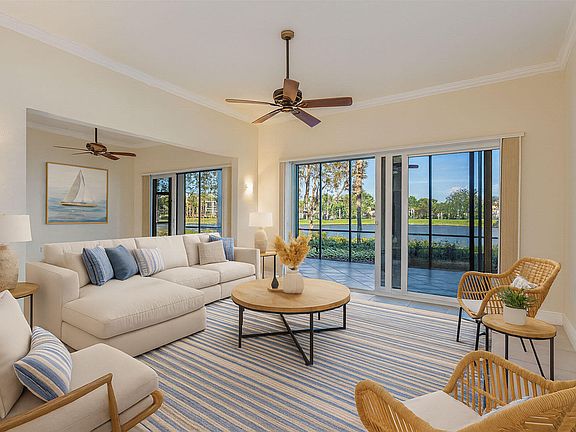 Discover this beautifully maintained three-bedroom, three-full-bath first-floor end-unit coach home in Laguna at Fiddler's Creek, offering an upgraded open-concept layout, expansive lake views, and exceptional privacy from its desirable side-unit location. This immaculate, original-owner residence has never been rented or previously offered for sale and showcases thoughtful enhancements, abundant natural light, and a neutral color palette that suits a wide range of design preferences. Evening skies often glow with vibrant sunsets, which fill the main living areas with warm, colorful light. The spacious great room feels even larger thanks to a wall removed from the original design, creating a bright, open flow between the main living spaces. Large porcelain tile on the diagonal, crown molding, recessed lighting, built-in speakers, and impact-resistant windows and sliders highlight the home's quality finishes. The screened lanai—with peaceful lake views and electric roll-down shutters for added protection and cleanliness—provides an ideal setting to enjoy morning coffee, breezy afternoons, and picture-perfect sunset reflections across the water. The well-appointed kitchen features granite countertops, a tumbled-marble backsplash, under-cabinet and recessed lighting, a breakfast nook, and stainless-steel appliances including a newer French-door refrigerator, newer five-burner natural gas range, Bosch dishwasher, and built-in microwave. All three bedrooms feature waterproof luxury vinyl plank flooring, ceiling fans, and generous closets. The primary suite offers tranquil lake views, impact sliders to the lanai, dual walk-in closets, and a spacious bath with dual sinks, jetted tub, separate shower, and private water closet. Both guest bedrooms have their own full bathrooms, each outfitted with porcelain tile and walk-in showers. Additional features include a laundry room with GE washer and gas dryer, laundry tub and cabinetry, a painted two-car garage, a tankless natural gas water heater, and a new HVAC system installed in July 2024. Laguna residents enjoy impact-glass windows and sliders, a newer roof, updated exterior paint, and a well-maintained, beautifully landscaped HOA. The home is also conveniently located near the Laguna village pool and mailboxes, adding everyday convenience to its list of perks. Residents of Fiddler's Creek enjoy lush tropical landscaping and an unparalleled resort lifestyle anchored by a recently renovated Clubhouse, world-class fitness center with classes and trainers, 10 new pickleball courts, 6 Har-Tru tennis courts, a spectacular resort-style pool with waterfalls, slides, hot tub, sauna, and steam room, along with exceptional indoor and outdoor dining options. Miles of scenic walking, jogging, and biking paths add to the community's natural beauty. Optional memberships—with no waiting list for golf—include the newly renovated championship golf course, the brand-new golf clubhouse, a marina, and a private beach club.