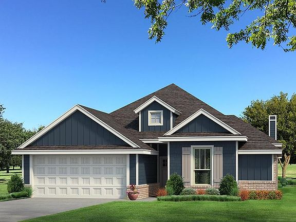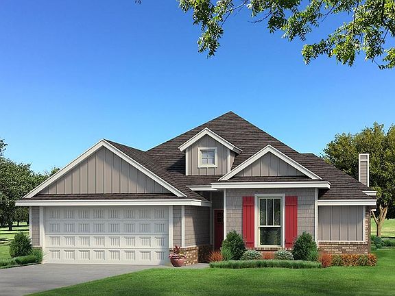 This Brinklee floor plan features 1,580 sqft of total living space, which includes 1,500 sqft of indoor living and 80 sqft of outdoor living. This home has 3 sizeable bedrooms, 2 full bathrooms, 2 covered patios, a utility room, and a 2-car garage with a storm shelter installed for your family's safety. The living room provides a stacked stone surround corner gas fireplace, large windows, a ceiling fan, wood-look tile, and Cat6 wiring. The kitchen includes a large corner pantry, 3 CM countertops, a large center island, adorning tile backsplash, dependable stainless steel appliances, custom-built cabinets with under cabinet lighting and decorative end panels, more wood-look tile, and stunning pendant lighting. The secluded primary suite offers a sloped ceiling detail, windows, a ceiling fan, and our cozy carpet finish. The attached prime bath spotlights a free-standing tub, a spacious walk-in shower, a double sink vanity, and a huge walk-in closet with exclusive access to the utility room! The covered outdoor living area includes a wood-burning fireplace, a gas line, and a TV hookup. Other amenities include Healthy Home Technology, a fresh air ventilation system, a tankless water heater, R-44 insulation, double glazed windows, and so much more!