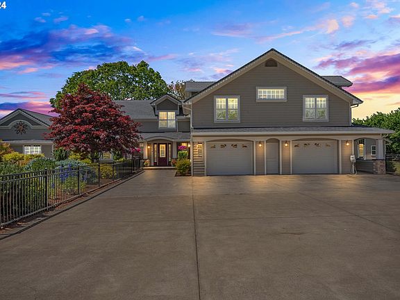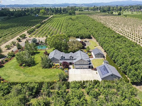 Don't miss this dream property! Nestled on 21 acres of picturesque land in the heart of the Willamette Valley, this exquisite estate offers the epitome of luxury living with its blend of opulence, tranquility and functionality. A true sanctuary, this property boasts a successful producing hazelnut orchard, meticulously maintained lawns and landscaping, tranquil koi pond and extensive patios, perfect for outdoor entertaining and relaxing. The home features 6 bedrooms, 7 bathrooms, a culinary enthusiast's dream kitchen featuring granite countertops, butler's pantry, 2 Bertazzoni gas ranges, pot filler and an abundance of storage. The main floor mother-in-law suite with exterior patio access. Five additional bedrooms on the upper level including the spacious primary suite featuring a soaking tub, walk in shower, walk-in closet and bidet. Store your toys and projects in the detached 3-bay 36x44 shop with 220-volt and create a gathering spot or home gym in the 24x40 recreational building with roll-up door, stamped concrete floors, full bathroom, and swim spa. Possible owner financing or ag farm loan- This exceptional property neighbors the award winning Shadow Hills Country Club.