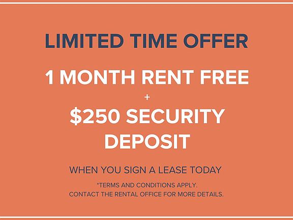 - Special offer! 1 Month Rent Free + $250 Security Deposit - Move in this month and you may qualify for our incentive.
