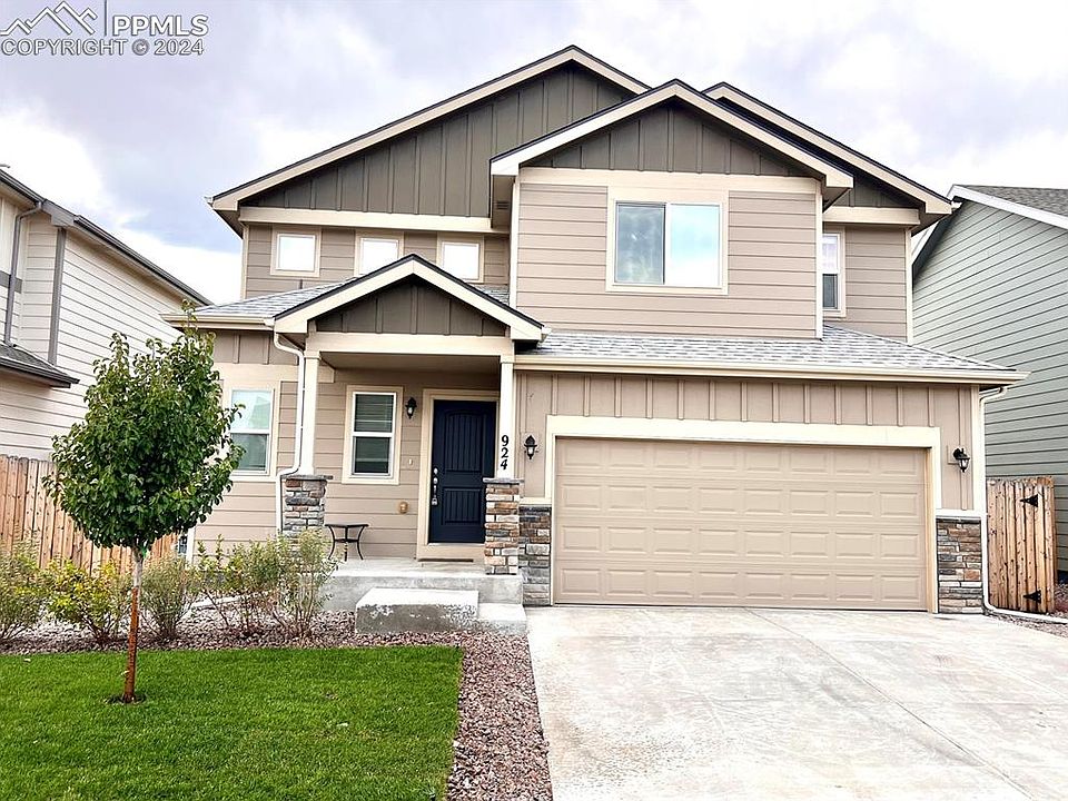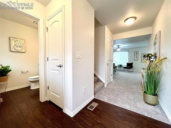 Step into this immaculate home, better than new, where elegance meets functionality. Featuring a spacious, open floor plan, it boasts three well-appointed bedrooms, three modern bathrooms, and a full crawl space perfect for additional storage. The entry, dining area, and kitchen have beautiful VP flooring, setting the stage for the beautiful design throughout. The kitchen offers stainless steel appliances, birch cabinets with crown molding, a central island, granite countertops, and ambient recessed lighting. The living room and primary bedroom offer ceiling fans for added comfort, while the entire home is equipped with A/C to keep you cool during the warmer months. Upstairs, you will find three bedrooms including the primary suite, two bathrooms, a cozy loft, and a convenient laundry room. The fully landscaped backyard, complete with an extended cement patio, invites you to enjoy breathtaking mountain views-a perfect space for outdoor entertaining or peaceful relaxation. Situated close to Powers Blvd amenities including dining, shopping, health clubs, hospitals, parks, and more, this home offers a lifestyle of convenience. Commuting to Peterson SFB, Schriever SFB, and Fort Carson is a breeze, with a quick drive to downtown COS adding to its appeal. Welcome home to a blend of luxury and comfort in every detail!