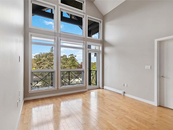 Top floor unitOpen-concept floor planModern kitchenQuartz countertopsStainless steel appliancesKitchen islandFloor to ceilings windows