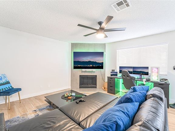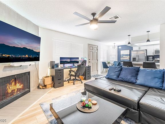 Experience modern comfort in this beautifully remodeled 2-bedroom, 2-bathroom first-floor condo located in the Rock Springs Vista 3 community. This home features stylish interior upgrades including a floor-to-ceiling fireplace, painted accent walls, ceiling fans, upgraded light fixtures, laminate wood flooring, and plush carpet. The kitchen offers a garden view with new white shaker cabinets, stainless steel appliances, sleek countertops, and a breakfast bar with seating. Both bathrooms have been fully updated with high-end shower systems, tiled finishes with niches, new vanities, framed mirrors, and contemporary lighting. Community amenities include a pool, spa, park, and guest parking. Conveniently situated just minutes from downtown Summerlin's shopping, dining, and entertainment.