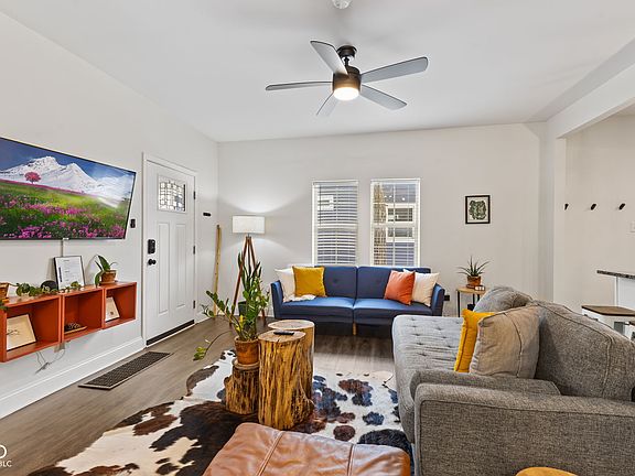 Prime location! With popular places nearby like the Kan-Kan Cinema, Woodruff Place, the Monon Trail and everything Mass Ave offers, this cute 3 bedroom home with modern touches is perfect for homeowners and/or investors! The covered front porch & trendy blue vinyl welcomes you in. Stepping inside, you're greeted by an open concept layout with a stylish spiral staircase which allows more space. The large primary bedroom is highlighted by a walk in closet featuring a built-in closet system. The kitchen boasts gorgeous granite countertops, an island with storage and bar-stool seating, ample white cabinetry and stainless steel appliances that all stay! A laundry room and separate bathroom with a tiled shower/tub combo are conveniently located on the main level. The 2 bedrooms on the upper level are nicely sized for kids and guests, and 1 includes a custom built-in dresser. Appreciate the convenience of having a generously sized basement for storage. Easily entertain guests out back in the fully fenced backyard with updated landscaping, fire pit and a hot tub! The parking pad can fit 2 cars and could be a good space for a future garage. With the option of being able to purchase the home fully furnished, this presents a great opportunity for first time homebuyers or as an AirBnb investment. Don't miss your chance to live or invest in one of Indy's most popular areas!