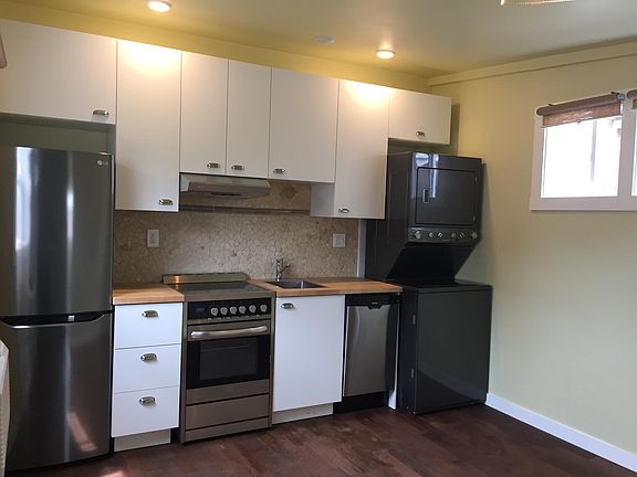 * Nearly new/only one previous tenant * Full kitchen w/IKEA cabinets * Stainless appliances including dishwasher * Custom tile backsplash and butcher block counter * Stacked washer and dryer * Maple wood floors in main area, carpet in bedroom * Custom ceramic tile floor in bathroom * Heating and air conditioning * Private deck with small backyard and raised bed for garden * Double-paned vinyl windows * On-street parking * Small dogs/ no smoking * Close to bus stops, Max and bike trails/routes * Great neighborhood shopping and restaurants * Walking distance to Mt. Tabor Park * First month's rent +$1035.00 security deposit (refundable) * Month-to-month rental agreement * Background and credit check required Owner pays for water/sewer, garbage, and wifi. There is a $78 monthly fee for gas & electric.