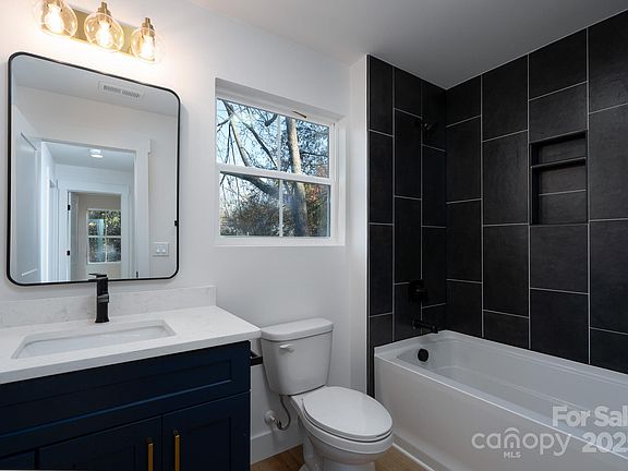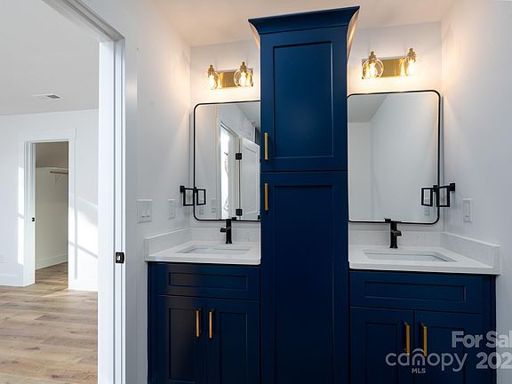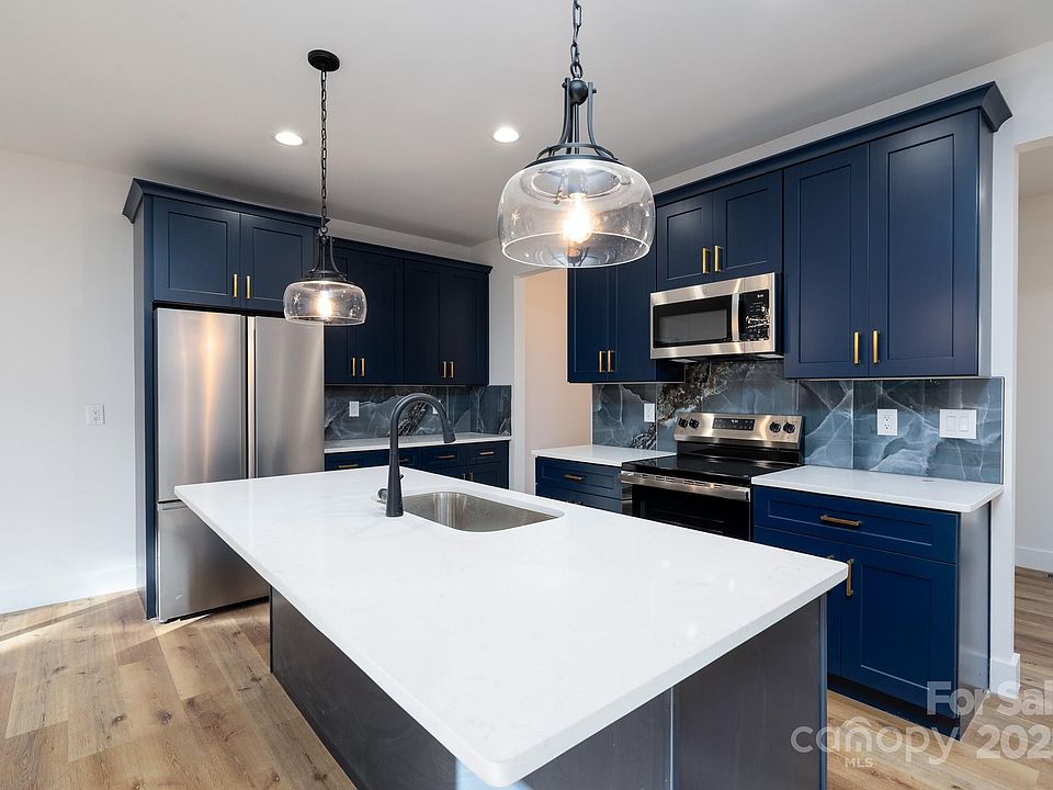 Contemporary 3BR/2.5BA home showcasing an open layout and a large kitchen, custom blue cabinets, and designer tile backsplash. Main-floor laundry for added convenience. The upper level features a spacious primary suite with a walk-in closet and beautifully tiled shower, plus two additional bedrooms and a full bath. Situated on a wooded lot with plenty of shade, this home is Impeccably finished and move-in ready