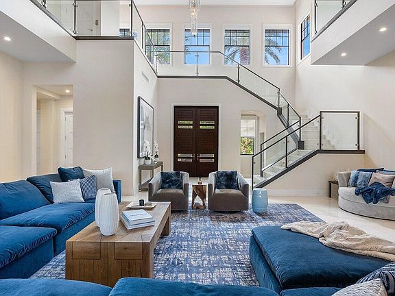 The covered entryway and custom-designed double front doors beckons to the home's first-floor interior, where the main living areas exude contemporary elegance with porcelain flooring, backlit volume cove ceiling detail in the living room, and elegant built-in shelving in the dining room. Just a few steps away, the kitchen is a chef's dream, equipped with countertops that boast a waterfall edge, chic glossy cabinetry, and modern appliances. A Wolf 6-burner range with griddle, Bosch dishwashers, double Wolf ovens, and a SubZero refrigerator and freezer are just some of its high-end features. A large island with seating, a built-in Thermador coffee bar, and wine cooler complete the space and add even more functionality for entertaining.
