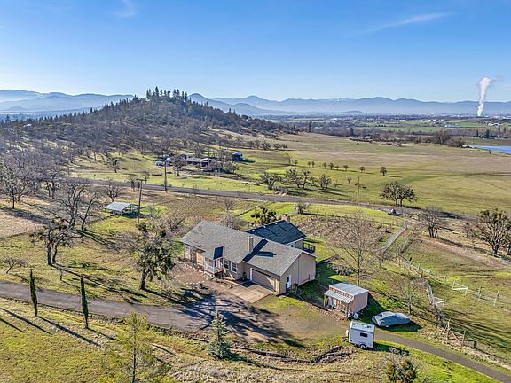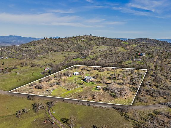 A working 10-acre farm featuring a 2,218 sqft home built in 1993, with 3 bedrooms and 2 baths, plus a finished basement. The home boasts a formal living room with a gas fireplace, kitchen equipped with gas cooktop, double ovens, breakfast bar, pantry, granite countertops, and stainless-steel appliances. The great room includes a wood-burning fireplace and abundant natural light, offering stunning valley views. The ceilings throughout are 9 ft high. There is a spacious deck ideal for entertaining and enjoying the spectacular views of the Table Rocks and Siskiyou mountains. An oversized finished garage was designed to accommodate a potential second story, which was never constructed, and provides ample storage, including usable attic space. The basement area contains two bonus rooms, each measuring 12'x 24'. The property is fenced and cross-fenced into 10 sections, includes a 30'x60' barn for animals, additional outbuildings in pastures, and a half-acre fenced vineyard.