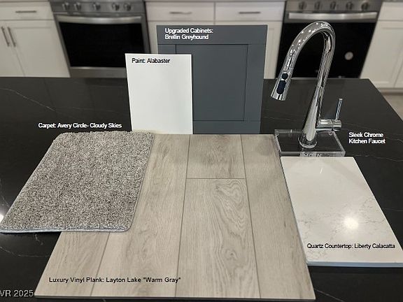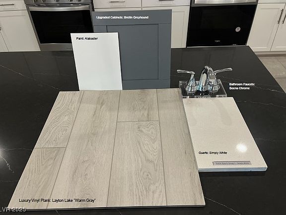 This stunning, two-story home showcases an open floor plan with 9-ft. first-floor ceilings. Kitchen is equipped with Whirlpool® stainless steel appliances, quartz countertops and Aristokraft® Gray cabinets. The primary bath features separate tub and shower, square undermount sinks. and soft water loop.